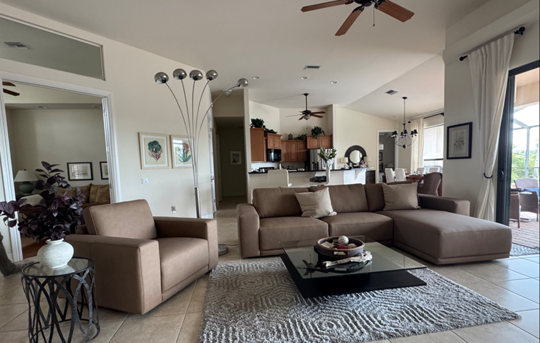 Der Außenbereich besticht durch seine Größe. Durch die Suedausrichtung des Poolbereichs können Sie den ganzen Tag die Sonne Floridas genießen oder sich auf der schattigen Veranda entspannen. Der große Pool mit Spa ist elektrisch beheizbar. Der überdachte Bereich verfuegt ueber einen Essstisch mit 6 Stuehlen. Es gibt 6 Sonnenliegen um in der Sonne zu relaxen, einen Mittagschlaf zu halten oder ein Buch zu lesen. Ein Grill steht fuer Sie bereit um gemuetliche Grillabende im Paradies zu geniessen.