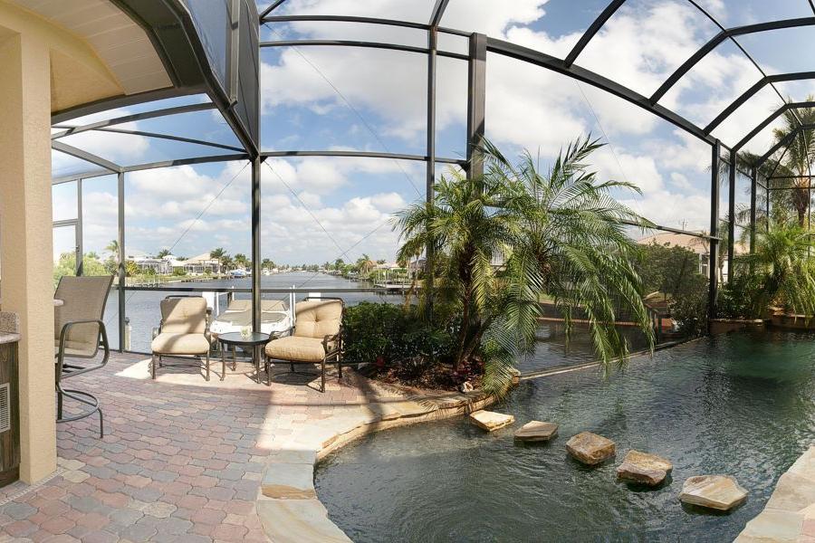 Villa Chandon – der Name steht fuer Staerke und Ausdauer, wonach auch die Materialien Innen sowie Aussen gewaehlt wurden. Das Haus befindet sich im Suedwesten von Cape Coral, in der Naehe des Cape Coral Harbor und direkt am Placentia Kanal. Dieses gemuetliche zweistoeckige Ferienhaus ist der perfekte Urlaubsort.