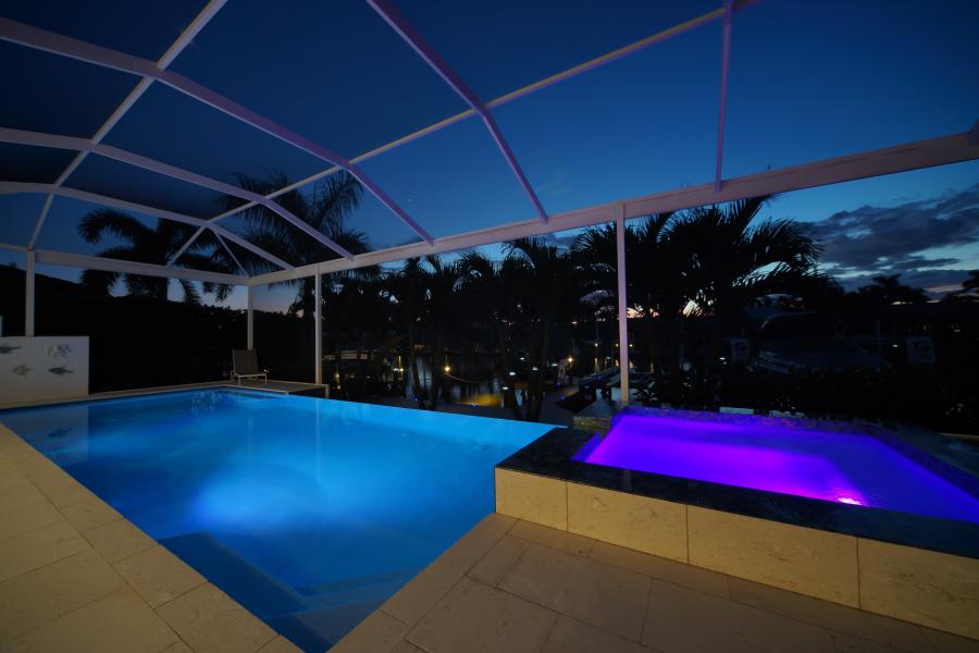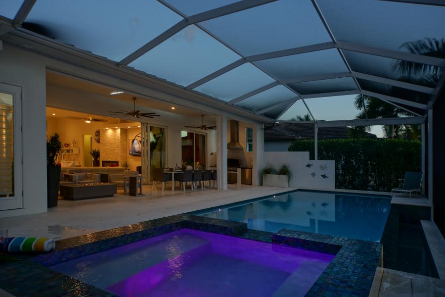 Der Außenbereich besticht durch seine Größe. Durch die Westausrichtung des Poolbereichs können Sie einen Großteil des Tages die Sonne Floridas genießen oder sich auf der schattigen Veranda auf den Loungemöbeln entspannen. Der elektrisch beheizte Pool mit Salzsystem (kein Salzfilm auf der Haut, nur weicheres Wasser) lässt keine Wünsche offen. Der große überdachte Bereich verwöhnt mit einer Sommerküche mit Grill. Hier können Sie den frischen Fang direkt zubereiten. Auch ein großer Fernseher und eine elektrische Feuerstelle sind vorhanden.
